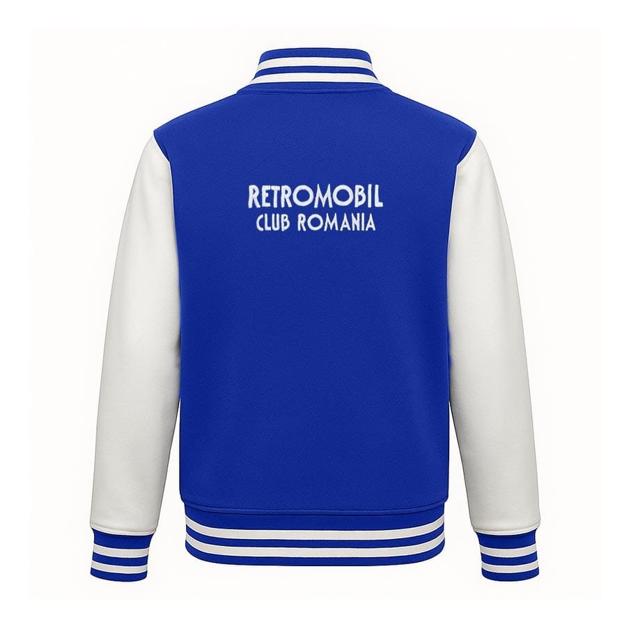 Hanorac unisex Royal Blue Retromobil România, realizat pentru pasionații de vehicule istorice care apreciază calitatea, confortul și stilul distinctiv. Modelul este construit în stil varsity jacket, cu corp Royal Blue intens și mâneci albe, completate de manșete, guler și bandă inferioară cu dungi decorative în aceeași nuanță de albastru.